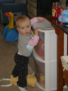 I (finally) realized this week that Aud really isn't a baby anymore. We took dinner to some friends on Monday evening that just had a baby a couple of weeks ago. Not only was this baby teeny tiny (she was 6 lbs, 3 oz at birth) which made me realize how big Audrey is, but Aud was all over the place! She crawled downstairs with the boys, then would come back up and pull up and pull stuff off of tables... she really is a toddler (albeit a non-walking one) now!